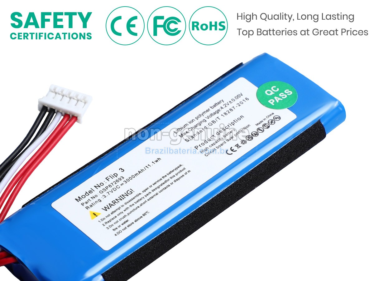 Brazilbateria adota o mesmo chip de gestão de fonte de alimentação TI importado dos Estados Unidos que o original, para obter compatibilidade, velocidade de inicialização, velocidade de Internet e taxa de carregamento consistentes com o original. Usa o material de proteção ambiental da carcaça externa ABS + PS resistente à alta temperatura e ao desgaste, com alta resistência e melhor tenacidade. O conector de fonte de alimentação e os grampos de parafuso de cada bateria JBL FLIP 3 PORTABLE SPEAKER são testados em máquinas reais para garantir uma compatibilidade perfeita e um ajuste perfeito.